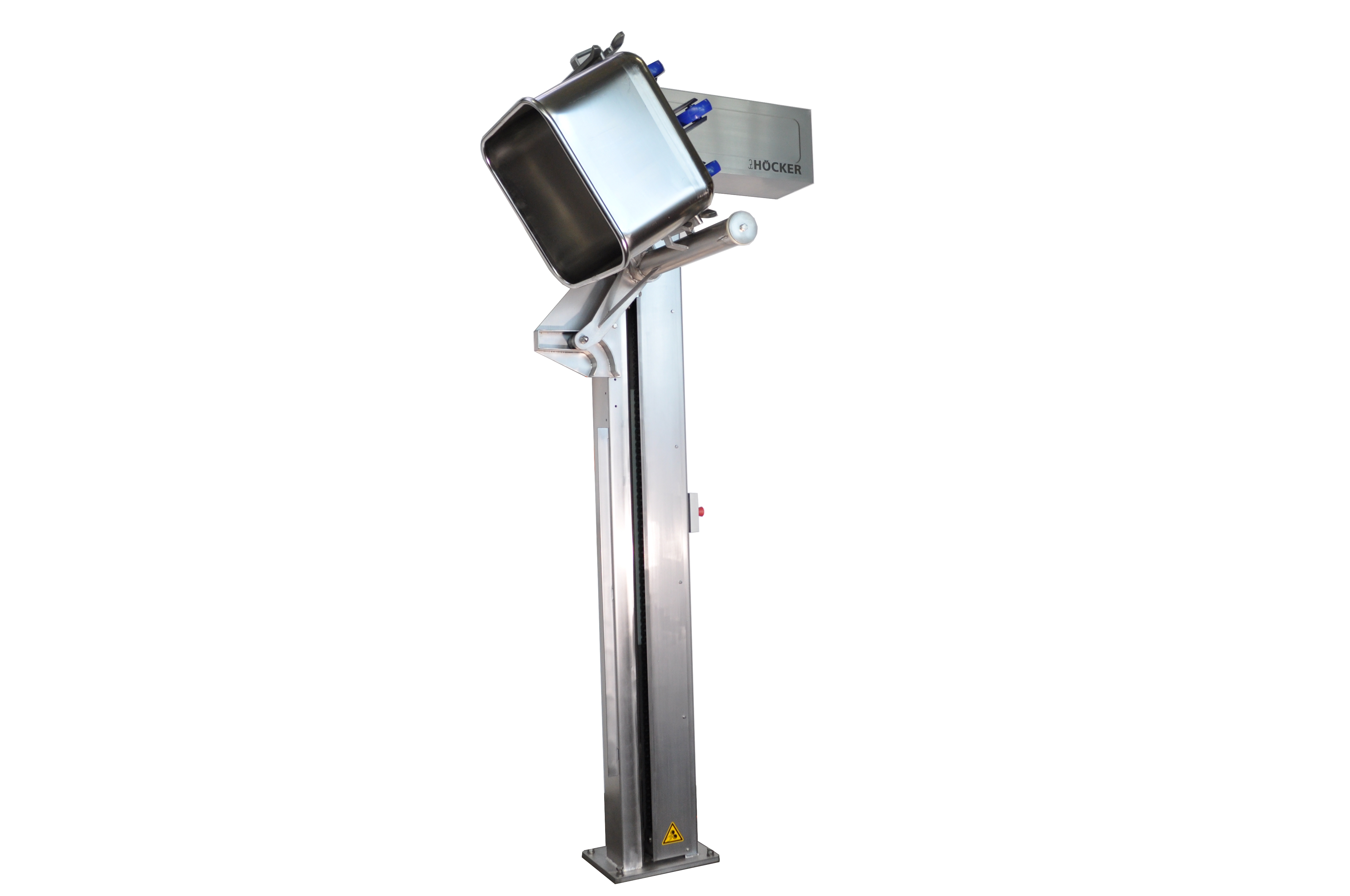 Der Höcker-Kunde, ein traditionsreicher Schlachterbetrieb, arbeitet täglich mit vielen 120-l-Beschickungswagen, die mit Fleisch und Nebenprodukten gefüllt sind. Wie in vielen Betrieben der Fleisch- und Lebensmittelindustrie sowie Pharmazie müssen diese Wagen nicht nur gehoben, sondern auch präzise gekippt werden, um die Inhalte in verschiedene Behälter zum Weitertransport, in Verarbeitungsmaschinen oder in anderen Produktionsbereichen zu entleeren. Die am Markt erhältlichen Standardlösungen wurden den Anforderungen in diesem individuellen Fall jedoch nicht gerecht. Auch für die bewährte Höcker Hebe-Kippvorrichtung L 25 ließen die beengten Platzverhältnisse in diesem Teil der Produktion keinen Platz, da sie die Behälter standardmäßig in die Richtung kippt, in die sie in die Hubgabel geschoben werden. Da der Kunde nicht auf die Vorteile einer Höcker L 25 verzichten wollte, war Umdenken gefragt. Es musste eine Lösung her, bei der die Behälter von vorn in die Hebe-Kippvorrichtung geschoben werden und diese die Behälter seitlich abkippt.