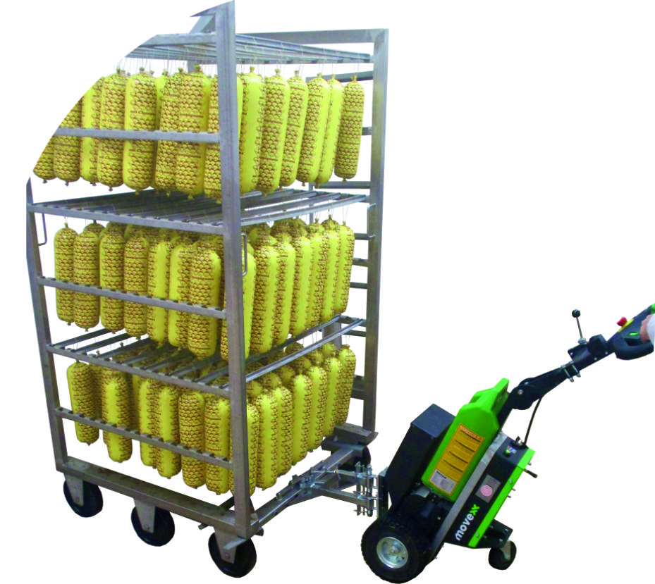 Für den Transport von Rauch-, Koch- und Wurstliegewagen hat sich der Movexx Elektroschlepper aus Edelstahl als ideale Lösung bewährt. Mit einer Zugkraft von bis zu 1500 Kilogramm bewegt er selbst voll beladene Wagen mühelos. Eine gefederte Stützrolle sorgt für den nötigen Fahrkomfort, und mit der langen Deichsel kann der Bediener aufrecht und rückenschonend hinter dem Gerät gehen. Die Muskelkraft wird vollständig durch den elektrischen Antrieb ersetzt – ein Knopfdruck genügt. Alle Bedienelemente sind kompakt am Deichselkopf angebracht, sodass sich der Schlepper intuitiv und sicher steuern lässt. Die kompakte Bauweise sorgt für hohe Wendigkeit, auch in engen Gängen oder zwischen Maschinen. Besonders hygienisch: Auch bei engen Wendungen, Kehren oder Bremsungen hinterlassen die profilierten Antriebsräder aus nichtkreidendem Vollgummi keine Spuren auf dem Boden.