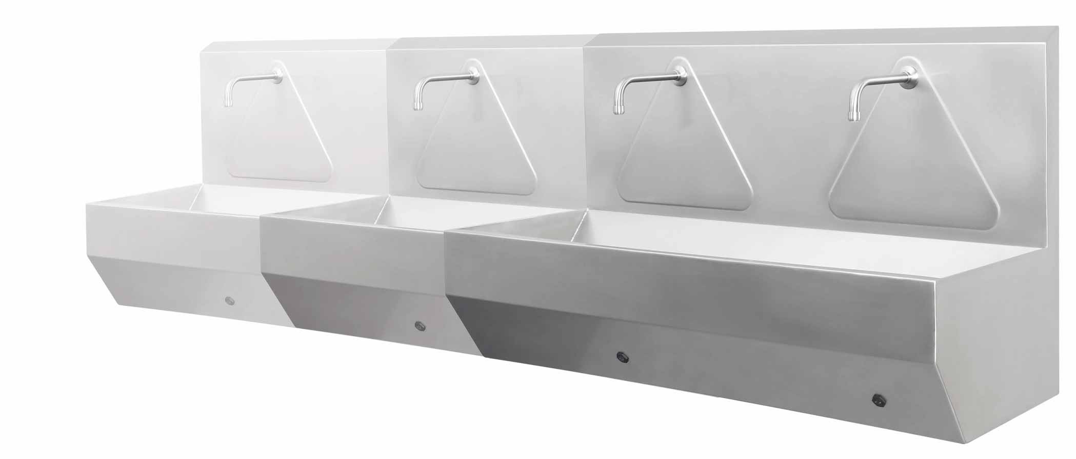 Für Bereiche mit höherem Personenaufkommen, in denen sich mehrere Mitarbeiter gleichzeitig ihre Hände waschen, sind Handwaschrinnen mit 2 bis 4 Waschplätzen eine bewährte Höcker-Lösung. Wie die Handwaschbecken, sind auch die Rinnen mit einer Spritzschutzwand und festem Edelstahlauslauf versehen und verfügen strukturell über die gleichen Vorteile. Kunden können zwischen Sensorsteuerung, Sensorauslauf oder Kniebedienung wählen. Als Zubehör sind passende Standfuß(-paare), z.B. klassisch oder mit Raum für die Verlegung von Wasserleitungen, und Rückwandabdeckungen erhältlich.
