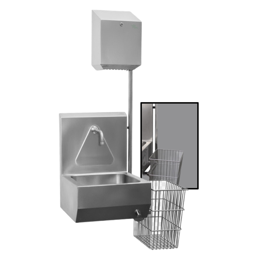 o Papierspender-Korbkombinationen inklusive Haltegestelle zur Wandbefestigung oder zur Befestigung direkt am Becken selbst, kombiniert mit Papierkorb und Falt- oder Rollenhandtuchspendern.